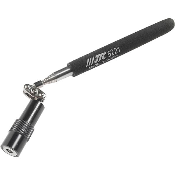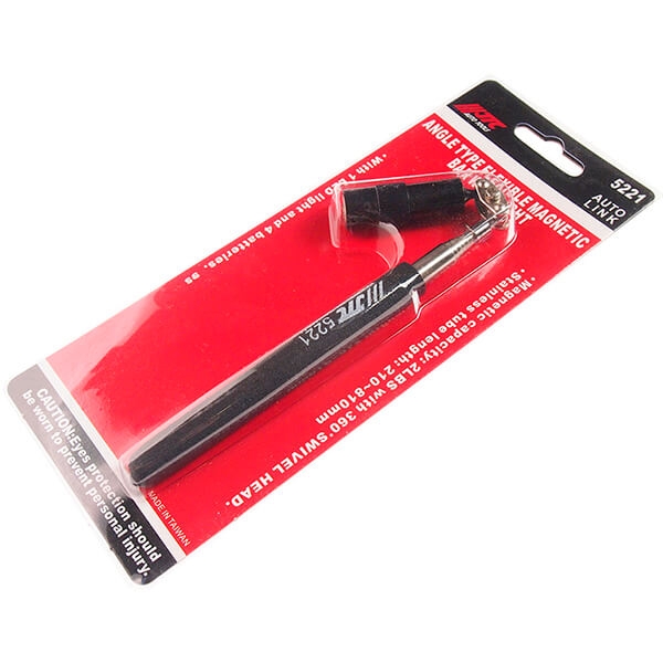 Держатель гибкий магнитный с фонариком JTC JTC-5221. Мощность магнита: 2LBS с поворотной головкой 360°. Длина стального патрубка: 210-810 мм. С фонариком 1 LED и 4 батарейками. Габариты: 225 х 95 х 30 мм. Вес: 40 гр.