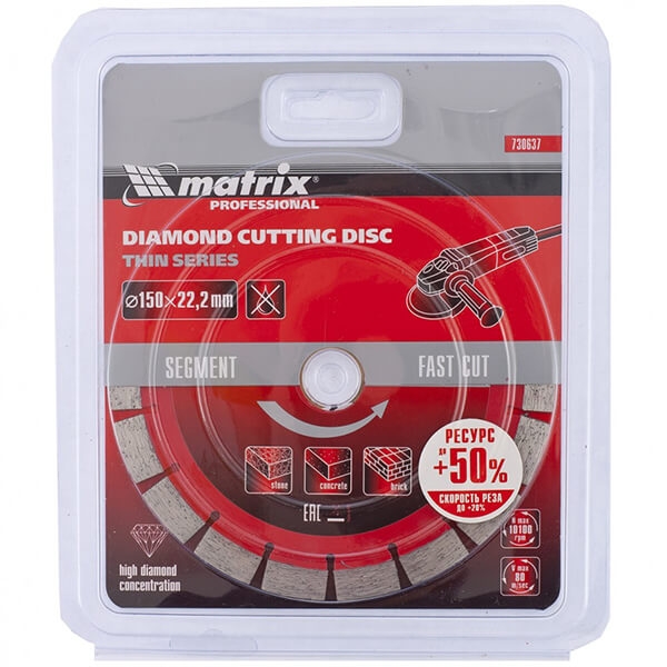 Диск алмазный отрезной сегментный 150 х 22,2 мм Matrix 730637 используется при сухой резке бетона, камня и кирпича. Данная линейка алмазных отрезных дисков выполнена по технологии ускоренного горячего прессования. Новая технология позволила добиться отличных режущих свойств при значительном снижении затрат на производство. Однородная по плотности и составу металлическая связка обеспечивает хорошее самозатачивание диска, увеличивая его производительность. За счет надежного сцепления связки с алмазом, алмаз вырабатывает свой ресурс до конца, это значительно повышает общую стойкость инструмента. Малая толщина диска обеспечивает меньшие нагрузки на электроинструмент, он режет быстрее и качественнее.