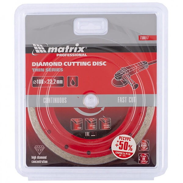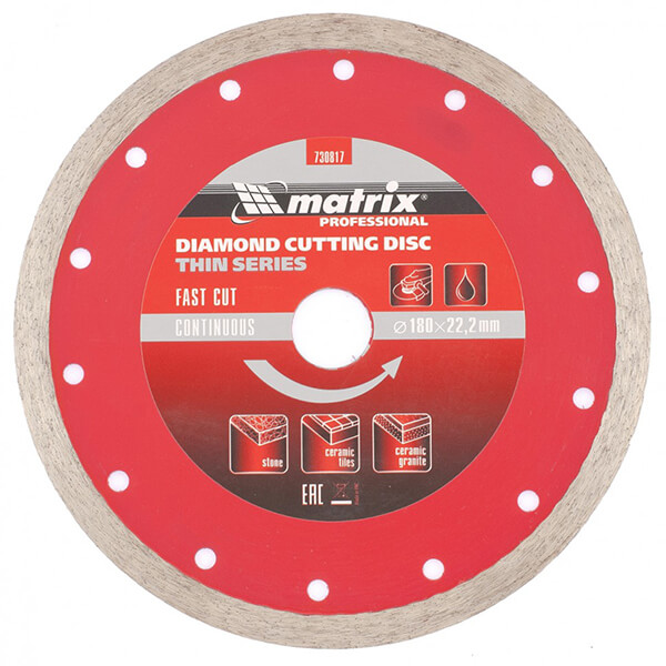 Диск алмазный отрезной сплошной 180 х 22,2 мм Matrix 730817 используется при мокрой резке керамогранита, камня, мрамора и плитки. Данная линейка алмазных отрезных дисков выполнена по технологии ускоренного горячего прессования. Новая технология позволила добиться отличных режущих свойств при значительном снижении затрат на производство. Однородная по плотности и составу металлическая связка обеспечивает хорошее самозатачивание диска, увеличивая его производительность. За счет надежного сцепления связки с алмазом, алмаз вырабатывает свой ресурс до конца, это значительно повышает общую стойкость инструмента. Малая толщина диска обеспечивает меньшие нагрузки на электроинструмент, он режет быстрее и качественнее.