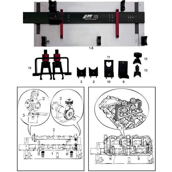 Фиксатор распредвала VW, AUDI, PORSCHE JTC JTC-4405 предназначен для фиксации распредвалов в ВМТ. Применяется для автомобилей Фольксваген (VW), Ауди (Audi), Порше (Poгsche) TDI 1.2, 1.6, 2.0, 2.7, 3.0 и 4.0 л., 4-клапанные, 8-цилиндровые. Коды двигателя: CAGA, CAGB, CAGC, САНА, САНВ , CFHC, СВАА, СВАВ, CFFB, CGLA, CGLB, CJCA, CJCB, СААА, СВАА, СВАВ, СВАС, СВВА, СВВВ, CBDA, CBDB, CBDC, ССНА, CEGA, CJAA, СAAВ, СAAС, CFJA, CFWA, САYВ, САYС, САYА. Оригинальные номера: Т40094, Т40095, Т40096.
