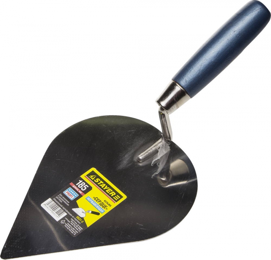 кельма используется для нанесения строительных растворов, нержавеющее стальное полотно обеспечивает прочность конструкции, а двухкомпонентная ручка удобство в работе