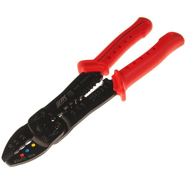 Клещи обжимные для электромонтажа 5 в 1 JTC JTC-5209 - это универсальный инструмент, который позволяет выполнить целый ряд функций: перекусить провод или винт, обжать и опрессовать клеммы, а также снять изоляцию с провода.
