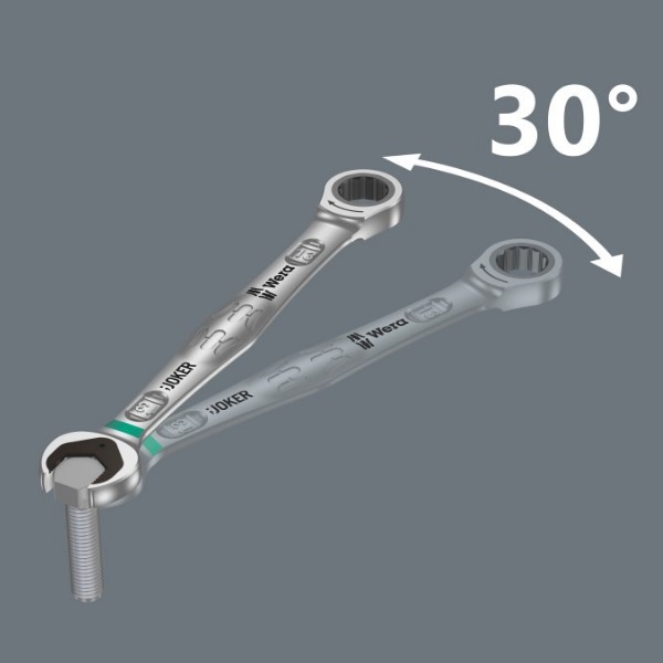 Ключ с кольцевой трещоткой 18 мм Joker Wera WE-073278 прекрасно справится с монтажом и демонтажом шестигранных крепежей. Геометрия двойного шестигранника обеспечивает геометрическое замыкание с болтом или гайкой, что уменьшает опасность соскальзывания. Угол возврата составляет всего 30°, благодаря чему вы экономите время при закручивании / откручивании крепежей.