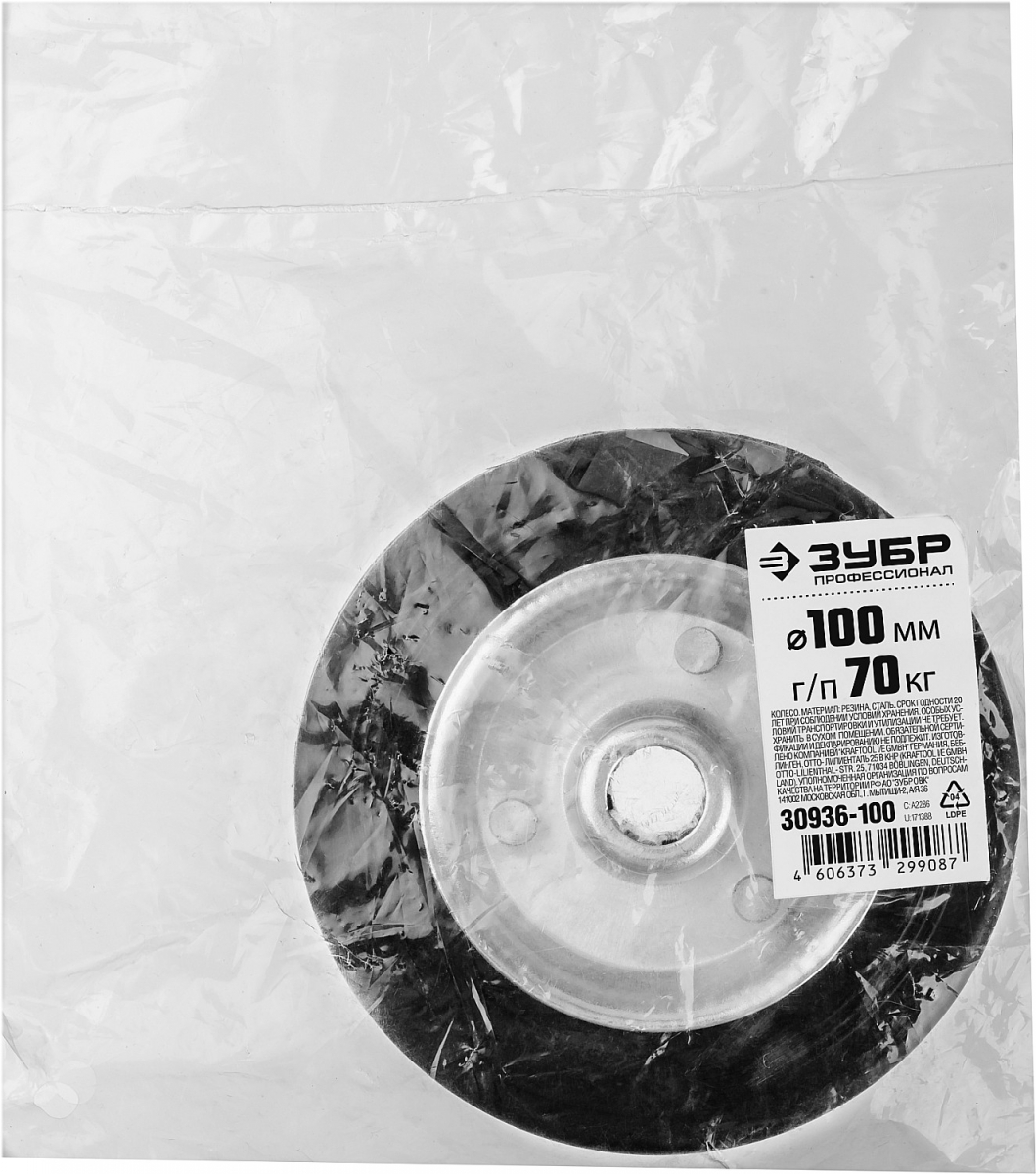 Колесо d=100 мм, г/п 70 кг, резина/металл, игольчатый подшипник, ЗУБР Профессионал 30936-100