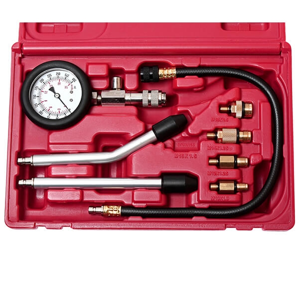 Порядок работы: Прогреть двигатель (недопустимо проводить измерение на холодном моторе); Демонтировать свечи зажигания, отсоединить высоковольтные провода от катушки зажигания; Установить компрессометр в отверстие одного из цилиндров, используя один из шлангов; На протяжении 5-10 секунд прокручивать стартером коленвал двигателя; Произвести снятие показаний с манометра; Повторить для остальных цилиндров. Важные рекомендации Тестирование должно проводиться только на бензиновых двигателях. Очень важно, чтобы во время измерений аккумуляторная батарея была полностью заряжена, в противном случае показания будут неверными.