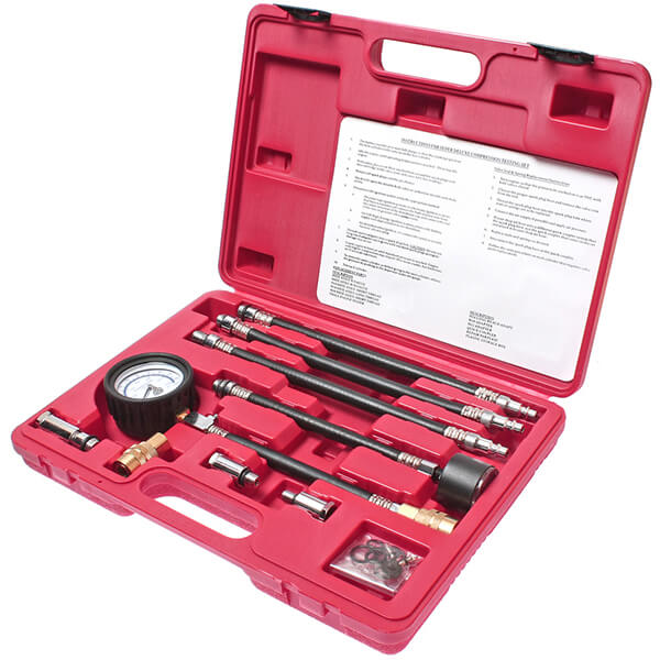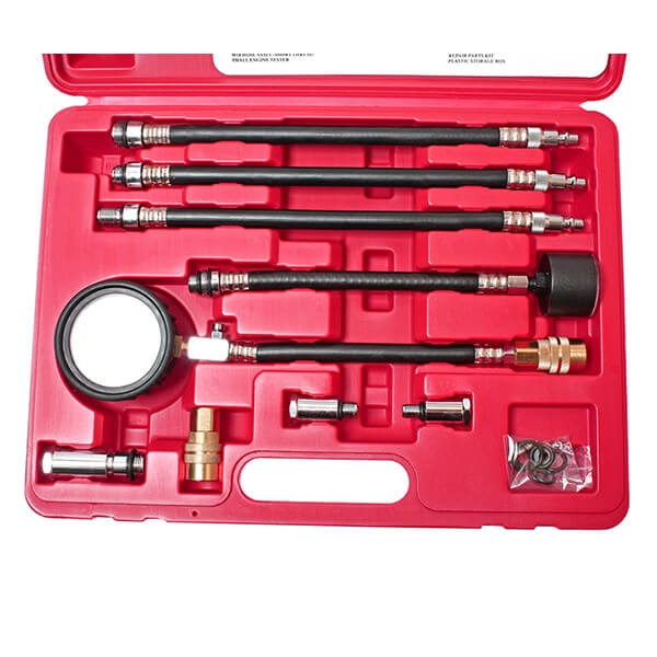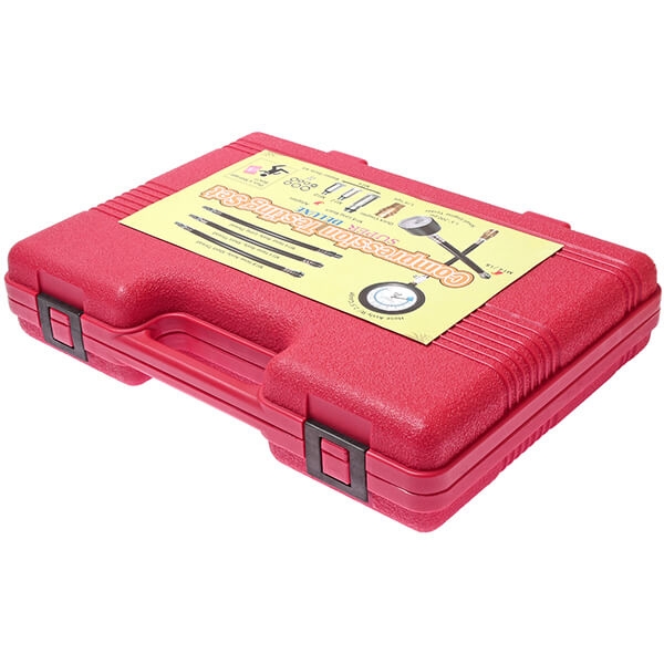 Комплектация: Манометр (0-300 PSI) с высоконапорным резиновым шлангом (длина с надставками 230 мм), на конце шланга быстросъемный соединитель, позволяющий повторять измерения сжатия без вывинчивания. На другом конце шланга клапан сброса. Шланг (3 шт.) длиной 300 мм с быстросъемными соединителями. Резьба наконечников M14/M14/M18. Малый манометр (0 - 200 PSI) с наконечником M14/M18. Металлические адаптеры M18/M12/M10. Быстросъемный соединитель 1/4". Сервисный комплект уплотнений.