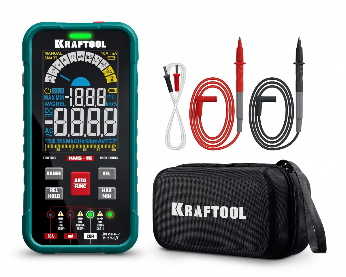 Профессиональный автоматический цифровой смарт-мультиметр KRAFTOOL гарантирует наивысшую точность измерений. Применение высококачественных материалов обеспечивает длительный срок службы. Прибор имеет функции измерения переменного и постоянного напряжения, сопротивления, емкости, проверки целостности цепей со звуковым сигналом, проверки диодов, измерения переменного и постоянного тока, измерение частоты, измерение температуры и режим относительных измерений.