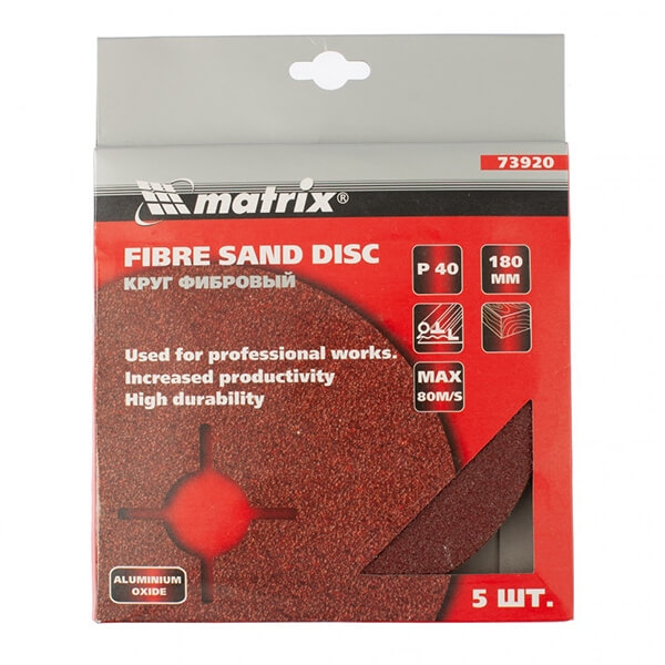 Круг фибровый, Р 40, 180 х 22 мм, 5 шт Matrix 73920 – идеальный инструмент для обработки различных материалов. По сравнению с кругами «под липучку» ресурс фибровых кругов в 2-3 раза выше. Прочная основа фибрового круга позволяет проводить грубую обработку металла, зачистки сварных швов и заусенцев, удаления ржавчины, снятие старой краски, различных загрязнений с помощью УШМ (болгарки) или дрели. Допускается применять для обработки цветных металлов, твердые породы древесины, пластмассы. Эластичность основы и небольшая толщина обеспечивают шлифовку и зачистку сложных криволинейных поверхностей. Фибровые круги устанавливаются на насадки для фибровых кругов (опорные тарелки) соответствующего диаметра.