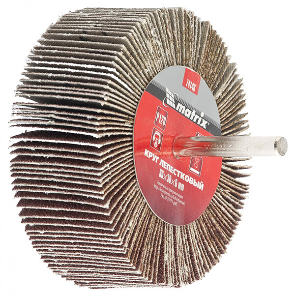 Круг лепестковый для дрели 80 х 30 х 6 мм, P150 Matrix 74147 применяется совместно с дрелями в шлифовальных работах по металлу, дереву и другим материалам. Круг лепестковый радиальный изготовлен из лепестков шлифовальной шкурки на тканевой основе, которые радиально расходятся от удерживающего их основания, служащего также хвостовиком.
