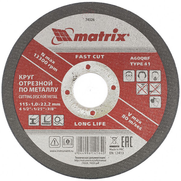Круг отрезной по металлу 115 х 1 х 22 мм Matrix 74326 предназначен для резки черного металла.