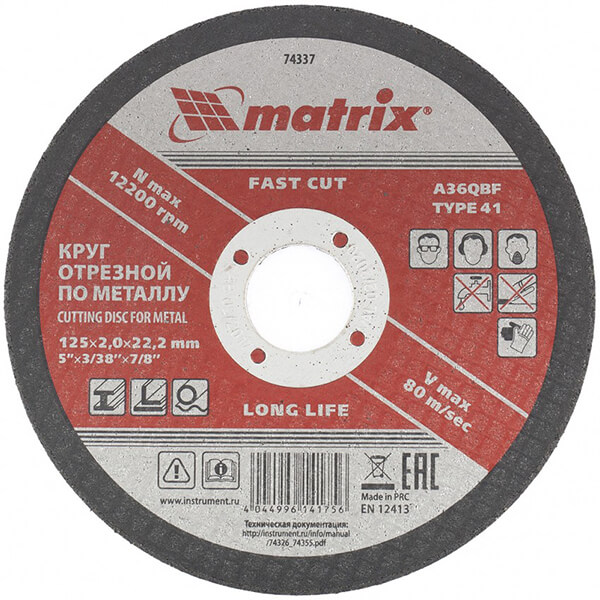Круг отрезной по металлу 125 х 2 х 22 мм Matrix 74337 предназначен для резки черного металла.