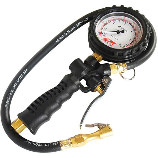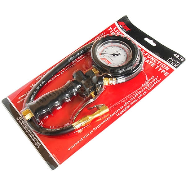 Манометр шинный 3-х функциональный 170PSI JTC JTC-4236 специально предназначен для точного измерения и регулировки давления в шинах. Манометр с рукоятью и ручным клапаном. Выполняет три функции: проверка давления, сбрасывает давление до нужного значения, накачивает до нужного значения. Большой (80 мм) датчик, с функцией вращения на 360°. Длина трубки: 600 мм. Прибор обладает легким весом: 630 гр. Погрешность: в диапазоне 30-45 PSI: +1 PSI, в остальном ±2 PSI. Диапазон измерений: 7-87 PSI/0.5-6 бар.