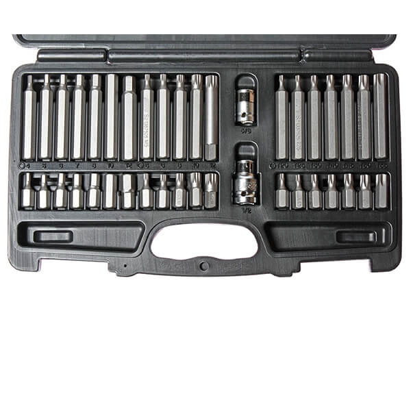 Набор бит 1/2", 3/8" SPLINE, TORX, HEX с держателем в кейсе 40 шт. JTC JTC-3965 предназначен для работы с крепежными изделиями. Все изделия выполнены из стали марки S2 и отличаются прочностью и долговечностью. Односторонние насадки с шлицем SL, Hex, Torx. Все биты поставляются в прочном переносном кейсе для удобства хранения и транспортировки. Размер хвостовика 10 мм. Набор идеален подходит для владельцев американских авто (Chevy/Ford). Габариты: 340 х 200 х 40 мм. Вес: 1,7 кг.