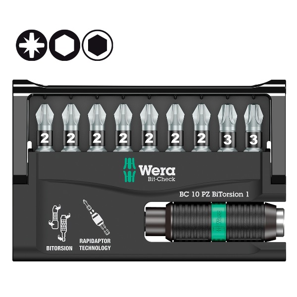 Набор бит Bit-Check 10 PZ BiTorsion 1 Wera WE-056368 предназначен для работы по монтажу и демонтажу резьбовых соединений.