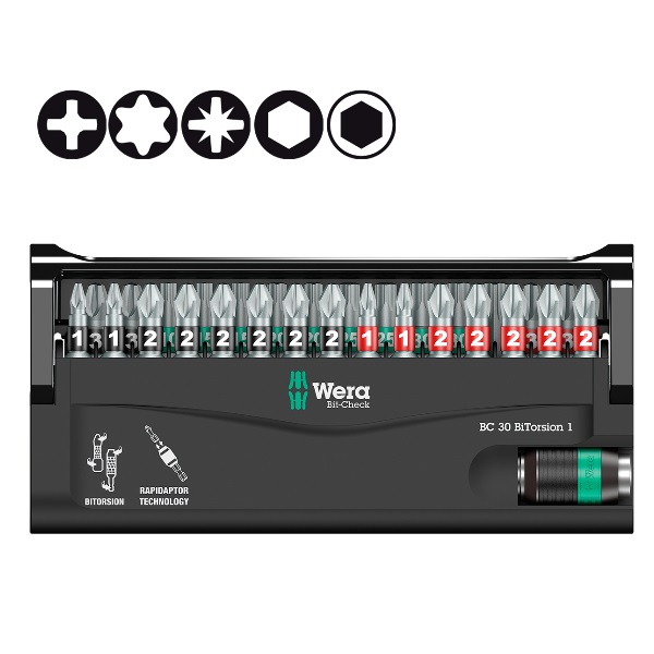 Набор бит Bit-Check 30 BiTorsion 1 Wera WE-057430 предназначен для работы по монтажу и демонтажу резьбовых соединений. Инструменты выполнены из инструментальной стали. Универсальный битодержатель Rapidaptor с быстрозажимным патроном. В наборах Bit-Check с идентификаторами „Take it easy& биты снабжены метками, которые благодаря своему цвету и указанию размера делают отбор нужного бита быстрым и легким.