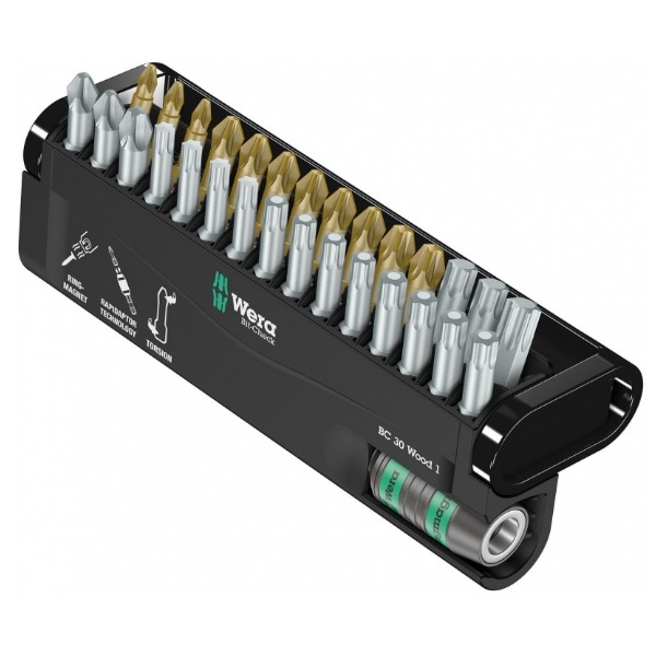Набор бит Bit-Check 30 Wood 1 Wera WE-057433 предназначен для работы по монтажу и демонтажу резьбовых соединений. Набор состоит из 30 предметов. Универсальный держатель Rapidaptor с кольцевым магнитом и быстрозажимным патроном.