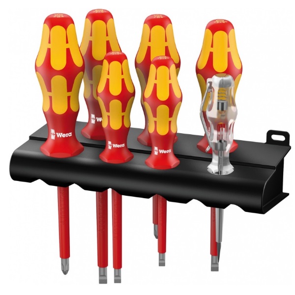 Набор диэлектрических отверток 1000V 160i/7 Wera WE-006147 состоит из 7 (семи) отверток + подставка. Многокомпонентные ручки Kraftform обеспечивают наиболее удобное и быстрое перехватывание отвертки. Инструменты выполнены с рабочим концом Lasertip - лазерными насечками для наилучшего сцепления отвертки с винтом. Применяется такой набор для винтов с прямым шлицем и с крестовым шлицем Phillips-Recess.