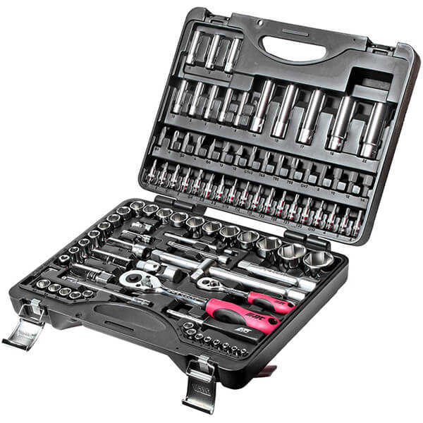 - Набор включает в себя 96 предметов, а именно: головки, воротки и гаечные ключи, чтобы переобуть автомобиль. Биты и отвертки, чтобы открутить TORX-крепление на двигателе или сиденье. Карданный шарнир, чтобы добраться до любого труднодоступного места. А еще есть клещи, пассатижи, бокорезы и другие инструменты для любых работ.