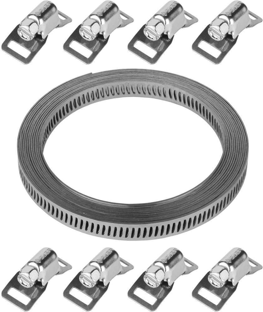 Весь размерный ряд хомутов в одном наборе ЗУБР! Штампованная лента длиной 3 метра позволяет создавать червячные хомуты любого диаметра. По всей длине ленты имеются просечки, расположенные на одинаковом расстоянии друг от друга. Червячный винт в замке снабжен шестигранной головкой и шлицем SL, что позволяет использовать при монтаже гаечный ключ или шлицевую отвертку.