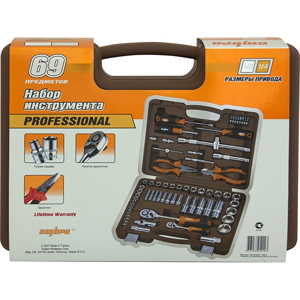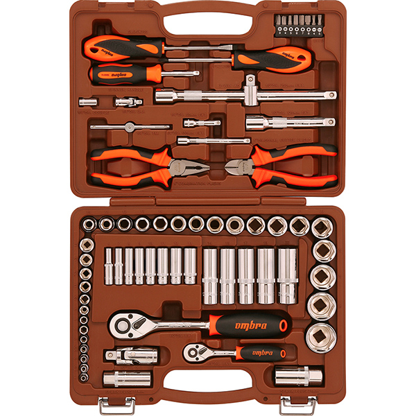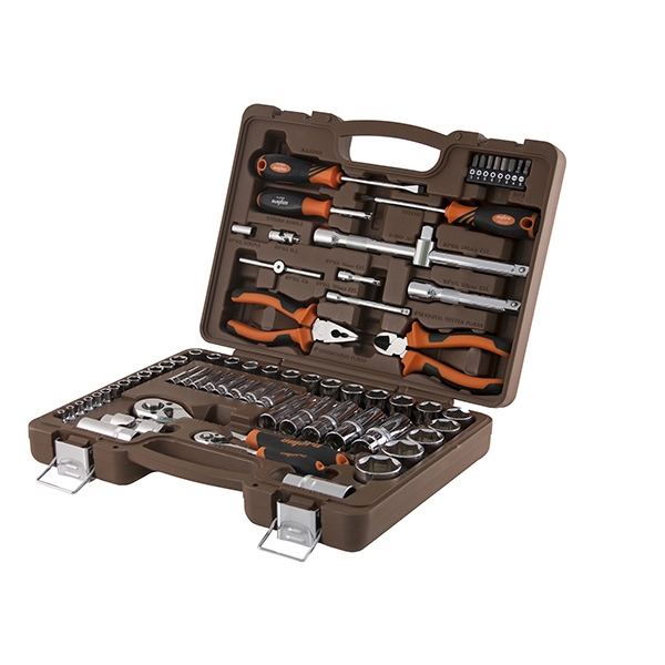 Головки торцевые 1/4"DR, 13 шт.: 4, 4.5, 5, 5.5, 6, 7, 8, 9, 10, 11, 12, 13, 14 мм; Головки торцевые глубокие 1/4" 8 шт. 6, 7, 8, 9, 10, 11, 12, 13 мм; Удлинитель 1/4"DR, 50 мм; Удлинитель 1/4"DR, 100 мм; Рукоятка трещоточная 1/4"DR, 72 зубца; Вороток Т-образный 1/4"DR, 120 мм; Шарнир карданный 1/4"DR; Рукоятка отверточная 1/4"DR; Переходник для вставок-бит 1/4"DR*1/4"HDR; Вставки-биты 1/4"DR крестовые (PH), 25 мм, 2 шт.: PH3, PH4; Вставки-биты 1/4"DR шлицевые (SL), 25 мм, 2 шт.: SL4, SL5; Вставки-биты 1/4"DR шестигранные (H), 25 мм, 4 шт.: H5, H6, H7, H8; Головки торцевые 1/2"DR, 17 шт.: 10, 11, 12, 13, 14, 15, 16, 17, 18, 19, 20, 21, 22, 24, 27, 30, 32 мм; Головки торцевые глубокие 1/2" 5 шт. 14, 15, 17, 19, 22 мм; Удлинитель 1/2"DR, 125 мм; Удлинитель 1/2"DR, 250 мм; Головка торцевая свечная 1/2"DR, 16 мм; Головка торцевая свечная 1/2"DR, 21 мм; Рукоятка трещоточная 1/2"DR, 72 зубца; Шарнир карданный 1/2"DR; Переходник 3-х сторонний 1/2"DR; Отвертка стрежневая крестовая BASIC, РН2х100 мм; Отвертка стрежневая шлицевая BASIC, SL6.5х100 мм; Бокорезы, 160 мм; Пассатижи, 160 мм; Кейс пластиковый для набора.