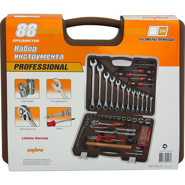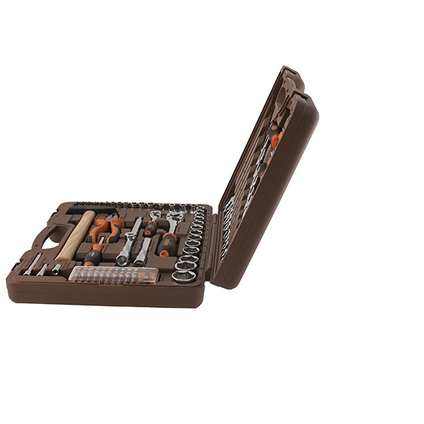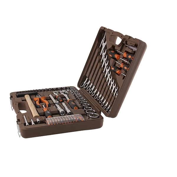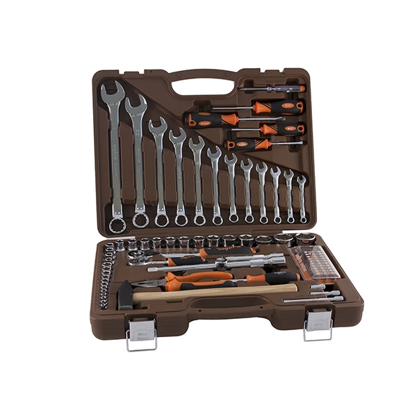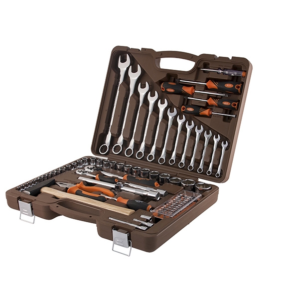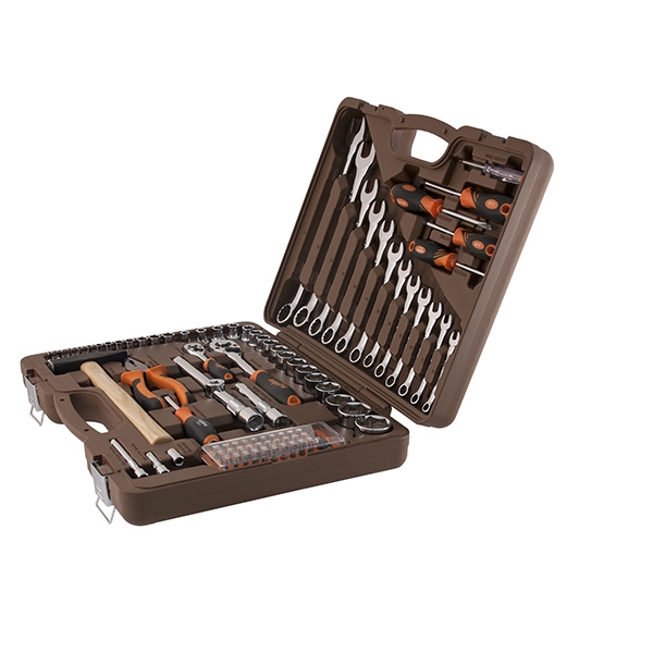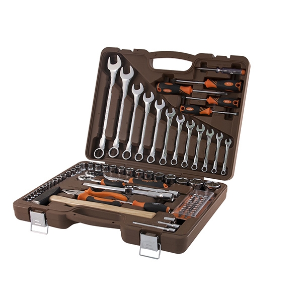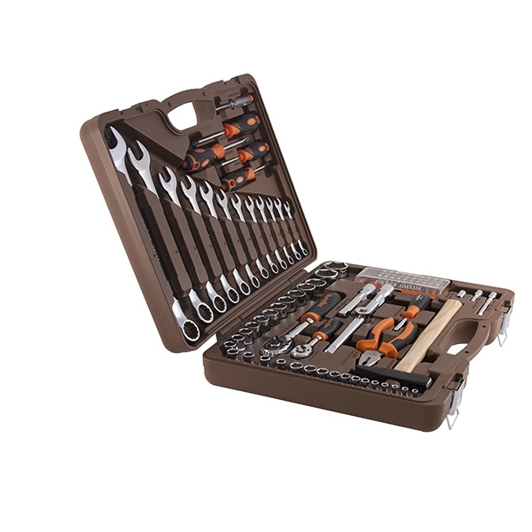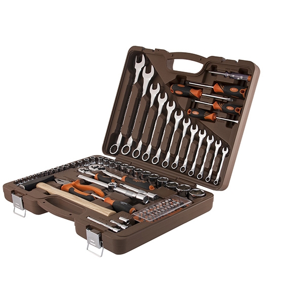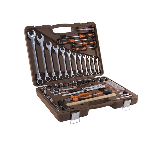 Головки торцевые 1/4"DR, 12 шт.: 4, 4.5, 5, 5.5, 6, 7, 8, 9, 10, 11, 12, 13 мм; Удлинитель 1/4"DR, 50 мм; Удлинитель 1/4"DR, 100 мм; Рукоятка трещоточная 1/4"DR, 72 зубца; Переходник для вставок-бит 1/4"DR*1/4"HDR; Набор вставок-бит, 31 предмет; Рукоятка отверточная 1/4"DR; Головки торцевые 1/2"DR, 17 шт.: 8, 9, 10, 11, 12, 13, 14, 16, 17, 18, 19, 21, 22, 24, 27, 30, 32 мм; Удлинитель 1/2"DR, 125 мм; Удлинитель 1/2"DR, 250 мм; Рукоятка трещоточная 1/2"DR, 72 зубца; Переходник 3-х сторонний 1/2"DR; Ключи гаечные комбинированные, 12 шт.: 8, 9, 10, 11, 12, 13, 14, 15, 17, 19, 22, 24 мм; Пассатижи, 180 мм; Молоток с деревянной рукояткой 300 гр.; Отвертки стрежневые крестовые BASIC, 2 шт.: РН1х75, РН2х100 мм; Отвертки стрежневые шлицевые BASIC, 2 шт.: SL5.5х75, SL6.5х100 мм; Отвертка индикаторная Кейс пласиковый; Цветная упаковка