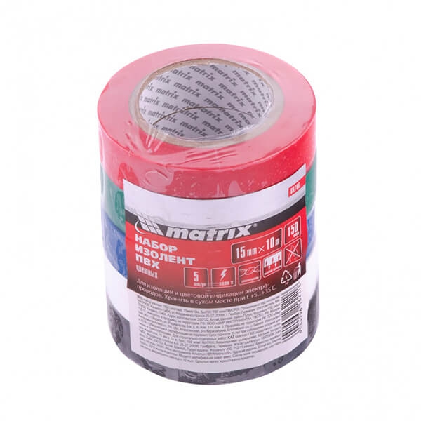 Набор изолент ПВХ цветных 15 мм х 10 м, 5 шт Matrix 88786 предназначен для проведения всех видов электромонтажных работ (электрическая изоляция проводников, защита от механических повреждений, цветовая маркировка).