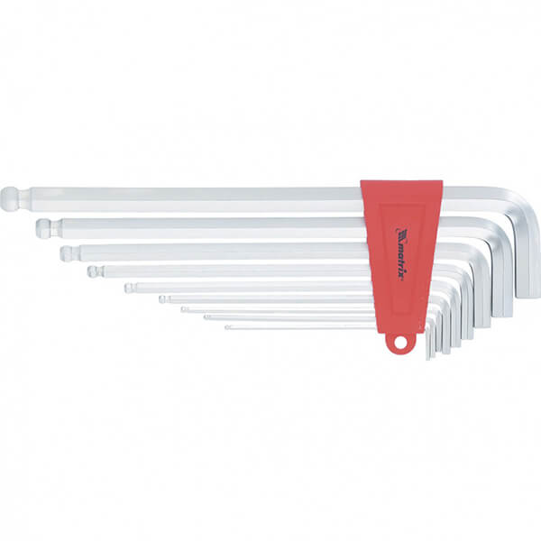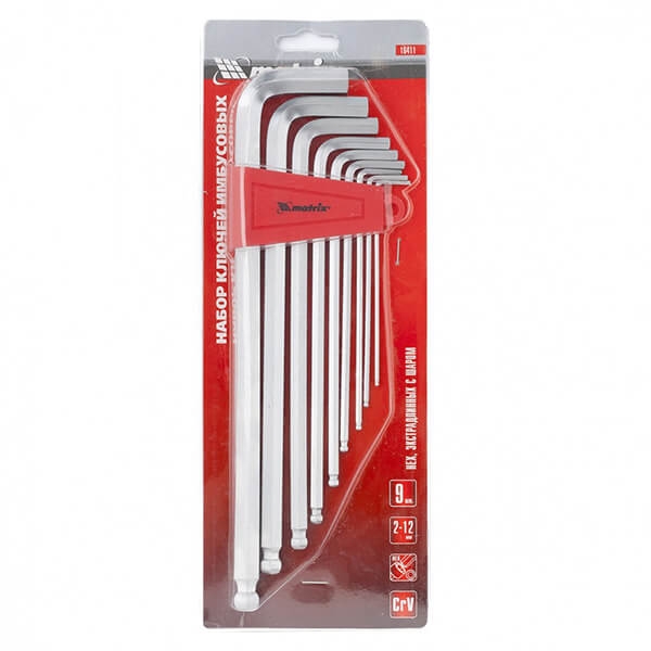 Набор ключей имбусовых HEX 2-12 мм, 9 шт. Matrix 16411 предназначен для работы с крепежом, оснащенным шлицом HEX (шестигранником). Ключи имеют Г-образную форму, изготовлены из высококачественной хромованадиевой стали твердостью 50 HRС. Сатинированное покрытие инструмента позволяет надежно удерживать ключи при высоком крутящем моменте. Шарообразный наконечник ключей позволяет выполнять работы под углом в труднодоступных местах. В состав набора входят ключи размером 2, 2.5, 3, 4, 5, 6, 8, 10 и 12 мм. Ключи крепятся на клипсе, удобной для хранения и транспортировки.