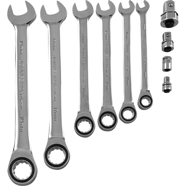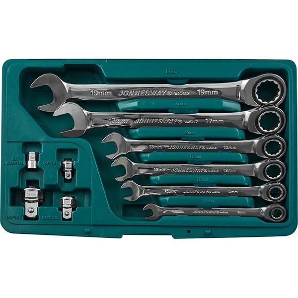 Ключи комбинированные трещоточные, 6 шт.: 8, 10, 12, 13, 17, 19 мм; Адаптеры, 3 шт.: 1/4 DR, 3/8 DR, 1/2 DR; Адаптер для бит 1/4 DR; Пластиковый кейс.