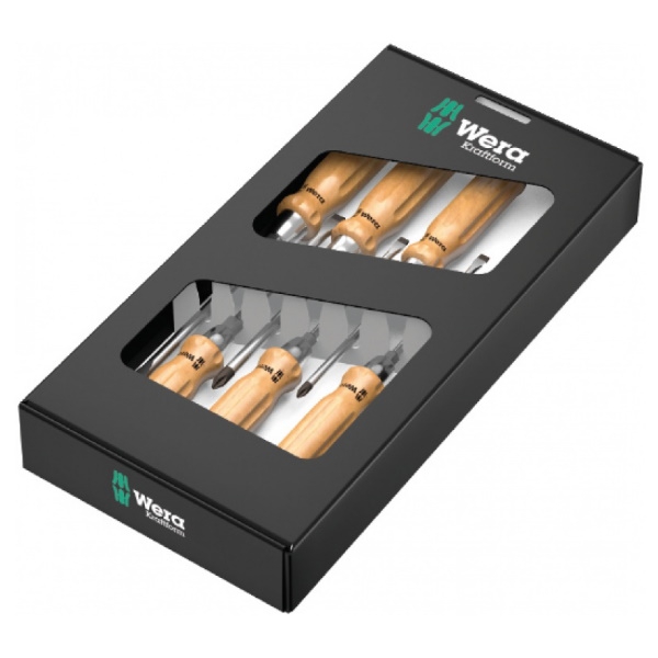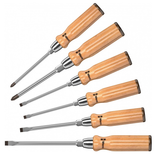 Набор отверток с деревянной ручкой 930/935/6 6 шт. Wera WE-018251 используется для винтов с профилем "прямой шлиц" и Phillips. Представленный набор состоит из 6 отверток с классическими деревянными рукоятками в картонном футляре с окнами. Высококачественный набор отвёрток с ручкой из твердого бука, что гарантирует долгий срок службы даже при больших нагрузках. Двуслойный кожаный задник на ручке и сквозной стержень отвёртки дополнительно обеспечивают безопасность при ударах молотком и снижают риски раскалывания ручки. Наличие приваренного к стержню отвёртки вспомогательного шестигранника служит для повышения передачи момента силы с помощью рожкового или накидного ключа. Наконечник Wera Black Point и трудоёмкий процесс закалки обеспечивают долгий срок службы наконечника, повышенную защиту от коррозии и высокую точность работы.