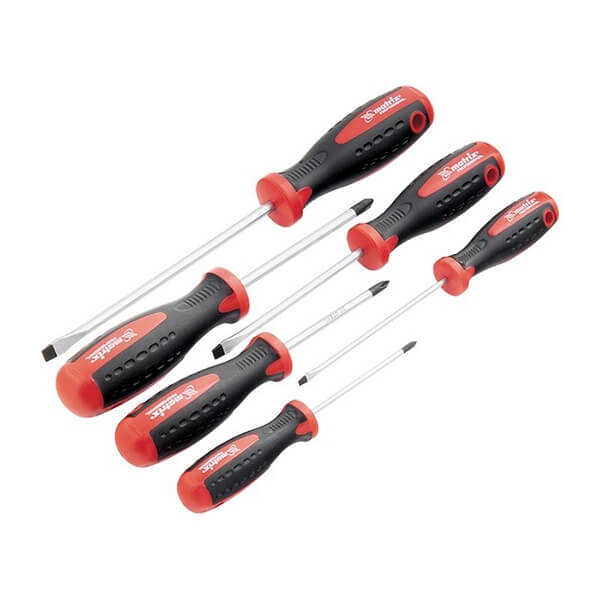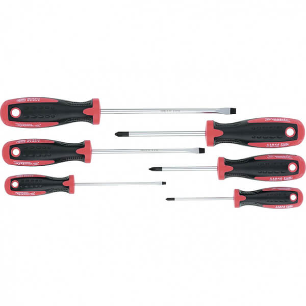 Набор отверток 6 шт. Matrix Professional 13303 предназначен для монтажа и демонтажа резьбовых соединений. Жало изготовлено из легированной инструментальной стали S2 и закалено. Наконечник жала намагничен. Твердость рабочей поверхности 58–62 HRC. Двухкомпонентные рукоятки эргономичной формы с отверстием для подвески изготовлены методом цельного литья для увеличения прочности сцепления ручки с рабочей частью. В комплект входят отвертки с профилями SL 1.2 x 6.5 x 150 мм, SL 1.0 x 5.5 x 125 мм, SL 1.0 x 4.0 x 100 мм, PH 2 x 100 мм, PH 1 x 75 мм, PH 0 x 80 мм.