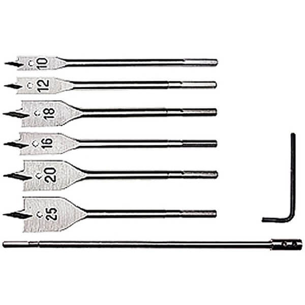 Набор перовых сверл по дереву с удлинителем 300 мм 6 шт Matrix 70406 предназначены для сверления отверстий в древесине. Перовые сверла изготовлены из углеродистой стали. Твердость режущих кромок 45–54 HRC. Комплектация: 10-12-14-16-18-20-25 мм. Набор 70406 дополнительно комплектуется удлинителем 300 мм. Хвостовики имеют шестигранную форму, что предотвращает поворот сверла. Центрирующее острие исключает необходимость в предварительном засверливании.