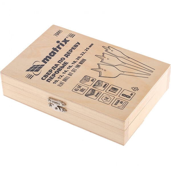 Набор сверл перовых по дереву 10-25 мм, 8 шт Matrix 70441 предназначены для сверления отверстий в древесине. Перовые сверла изготовлены из углеродистой стали. Твердость режущих кромок 45–54 HRC. Хвостовики имеют шестигранную форму, что предотвращает поворот сверла. Наличие подрезных кромок, которые позволяют получать отверстия с улучшенным качеством поверхности. Сверла имеют нитрид-титановое покрытие TiN, что повышает износостойкость и долговечность инструмента. Удобный деревянный кейс для хранения.