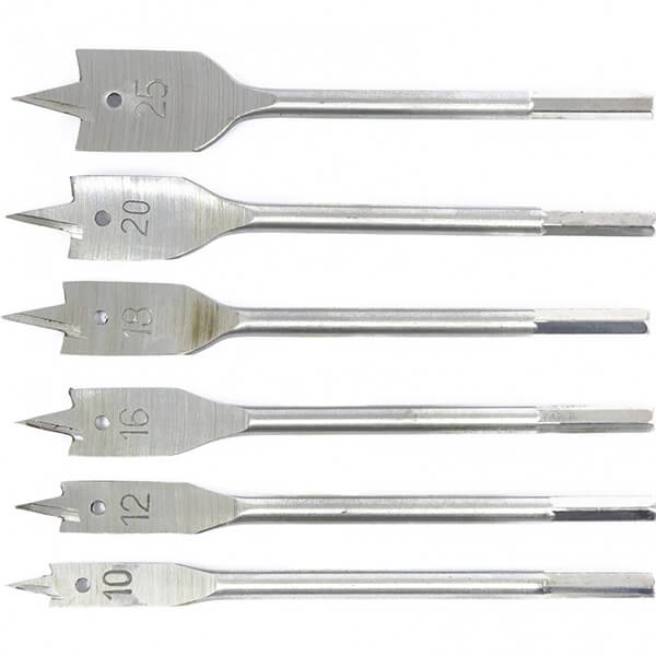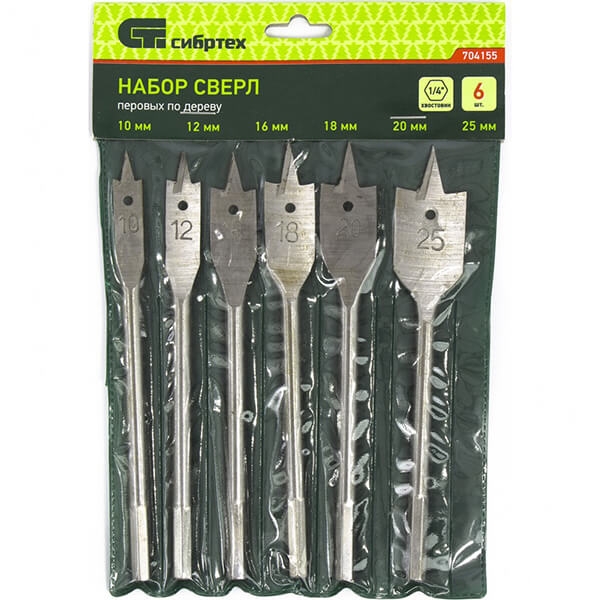 Набор сверл перовых по дереву 10-25 мм, ш/хв., 6 шт Сибртех 704155 изготовлен из углеродистой стали.