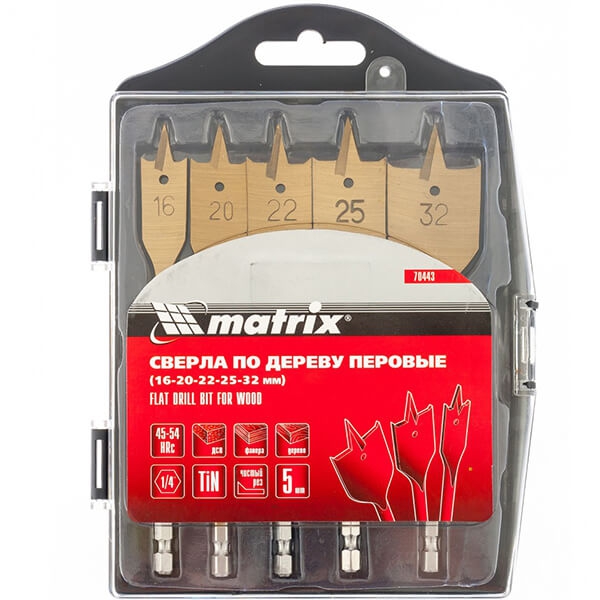 Набор сверл перовых по дереву 16-32 мм, 5 шт Matrix 70443 предназначены для сверления отверстий в древесине.