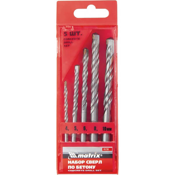 Набор сверл по бетону 4-10 мм в кейсе, 5 шт Matrix 70730 предназначен для сверления в бетоне. В набор входят наиболее востребованные размеры сверл по бетону (4 мм, 5 мм, 6 мм, 8 мм, 10 мм)с трехгранным хвостовиком серии 70720-70725. Твердосплавная пластина ВК8, корпус сверл выполнен из стали 40Х, твердость 44-48 HRC, канавка с двойной спиралью. Для удобства хранения сверла размещены в пластиковом кейсе.