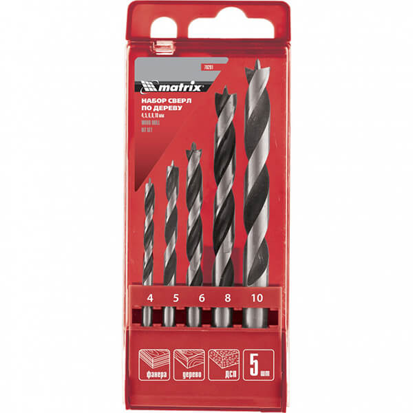 Набор сверл по дереву 4-10 мм, ц/хв., 5 шт Matrix 70281 предназначены для сверления отверстий разных диаметров в деревянных изделиях.