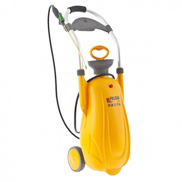 Опрыскиватель на колесах 16 л Palisad Luxe 64787 с помповым насосом, шлангом, разбрызгивателем подходит для полива и обработки химикатами растений, мытья стен и окон.