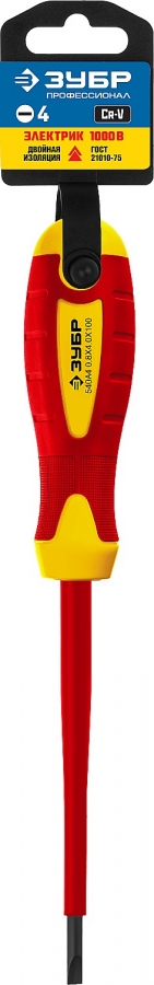 Отвертка диэлектрическая до 1000В, ЗУБР Профессионал ПРОФИ ЭЛЕКТРИК 25261-4.0-100, Cr-V, трехкомпонент рукоятка, SL 4 x 100 мм 25261-4.0-100_z01