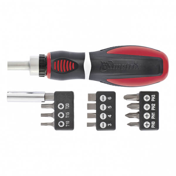 Отвертка реверсивная с набором бит 11 шт. Matrix Master 11546 предназначена для монтажа и демонтажа резьбовых соединений. Реверсивный механизм отвертки позволяет заворачивать и отворачивать крепеж без перехватывания ручки. Отвертка имеет двухкомпонентную антискользящую рукоятку эргономичной формы, оснащена набором сменных бит самых распространенных профилей, изготовлена из хромванадиевой стали. В комплектацию входят биты с профилями SL, PH, PZ, TORX/