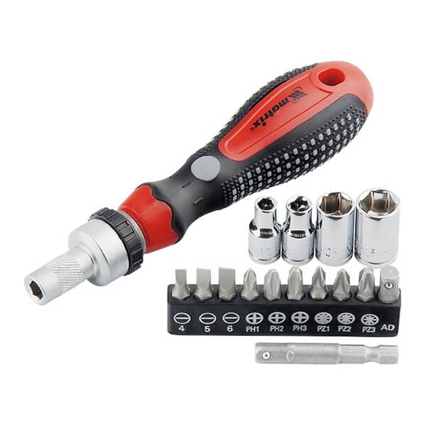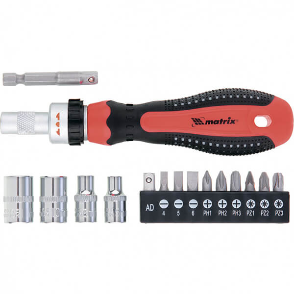 Отвертка реверсивная с набором бит и торцевых насадок 1/4" 16 шт. Matrix 11332 используется для ремонтно-сборочных работ. Насадки выполнены из высококачественной хромованадиевой стали, что увеличивает их рабочий ресурс.