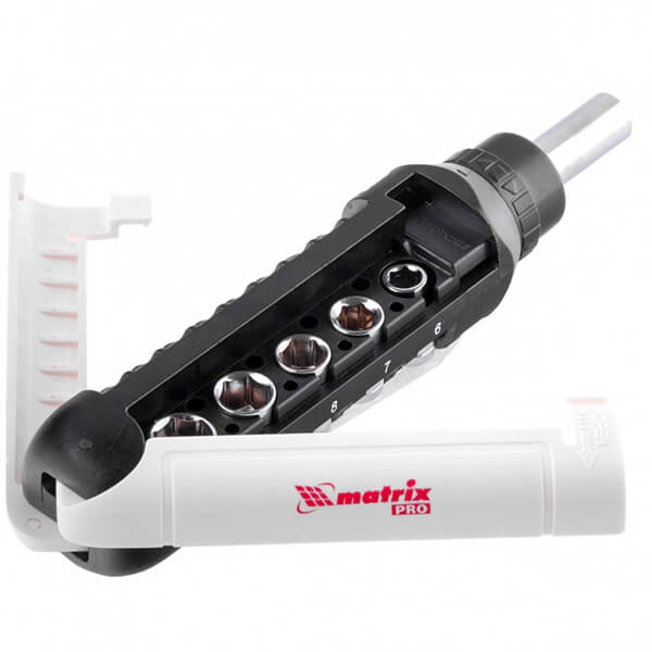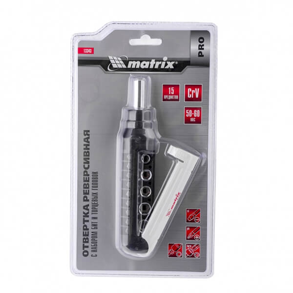 Отвертка реверсивная с набором бит и торцевых головок, 15 шт. Matrix Pro 13343 предназначена для различных типов резьбовых соединений.
