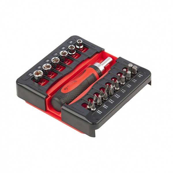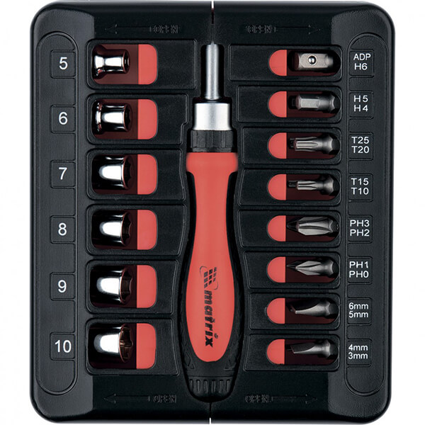 Отвертка реверсивная с набором бит и торцевых головок 23 шт. Matrix 11786 предназначены для монтажа и демонтажа резьбовых соединений. Каждый набор включает в себя отвертку с реверсивным механизмом, повышающим комфорт и скорость выполнения работы. В комплект входят битыи торцевые головки различного типоразмера, изготовленные из хромованадиевой стали.Для удобства хранения и транспортировки наборы упакованы в пластиковые кейсы.