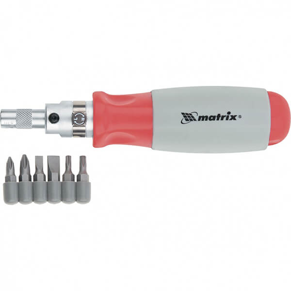 Отвертка реверсивная с набором бит 6 шт. Matrix 11549 обладает двухкомпонентной эргономичной рукояткой. Реверсивный механизм дает возможность работы без перехватывания рукоятки, что позволяет максимально снизить физическое напряжение при работе.