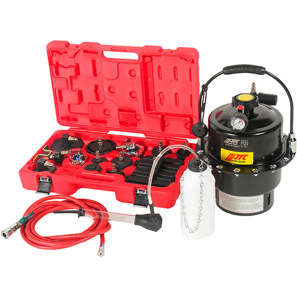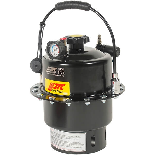 Приспособление для прокачки тормозов JTC JTC-4331 подходит как для прокачки тормозной системы, так и для прокачки гидравлической системы привода сцепления. Позволяет без утечек и других традиционных ошибок заменять тормозную жидкость. Комплект специальных адаптеров для различных тормозных цилиндров предотвращает утечки. Вместительный бак на 5 литров. Легко контролируемая замена тормозной жидкости. Размер воздушного штуцера: 1/4" РТ. После каждого использование давление в оборудовании должно быть сброшено с помощью открытия клапан давления.