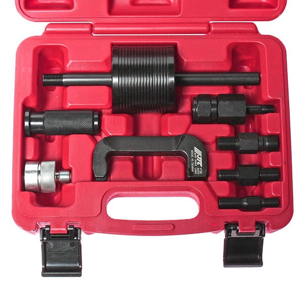 Съемник форсунок для дизельных двигателей MERCEDES JTC JTC-4718A предназначен для снятия прикипевших форсунок на двигателях с системой впрыска топлива Common Rail без необходимости снятия головки блока цилиндров. В комплект входит ударный съемник для форсунок. Неприкипевшие форсунки свободно изымаются без необходимости их выламывания. Работы также производятся без снятия ГБЦ. В комплекте: 3 адаптера М17х1.0; М27х1.0 (Bosch); М12х1.75. Применяется в автомобилях Мерседес (Mercedes-Benz) CDI с двигателями 611 ОМ, 612, 613, 646, 647, 648. Упакован в прочный переносной кейс. Количество в оптовой упаковке: 6 шт. Габариты: 275 х 220 х 80 мм. Вес: 3,57 кг.