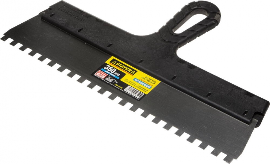 Благодаря зубчатой кромке шпатель идеально подходит для работы со строительными и клеевыми смесями, полотно из нержавеющей стали обеспечивает надежность и долгий срок службы, а удобная пластмассовая рукоятка создает условия для комфортной работы