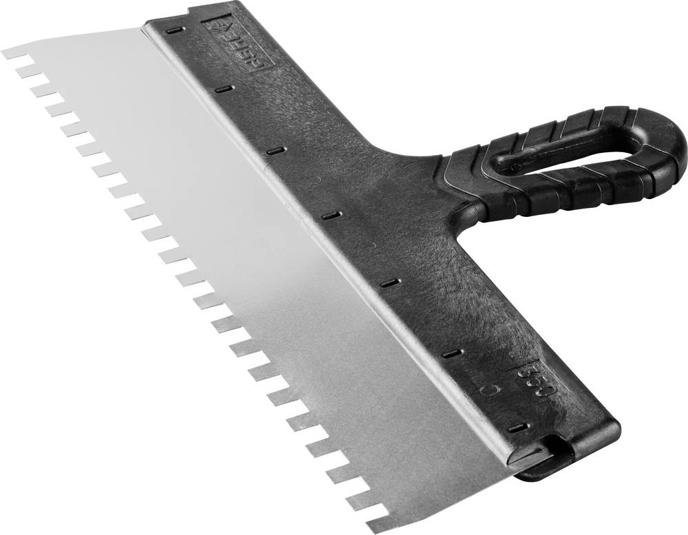 Благодаря зубчатой кромке шпатель идеально подходит для работы со строительными и клеевыми смесями, полотно из нержавеющей стали обеспечивает надежность и долгий срок службы инструмента, а удобная пластмассовая рукоятка создает условия для комфортной работы