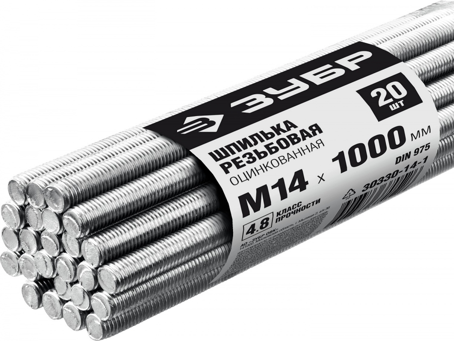 Шпилька резьбовая DIN 975, М14x1000мм, 20 шт, класс прочности 4.8, оцинкованная, ЗУБР 30330-14-1