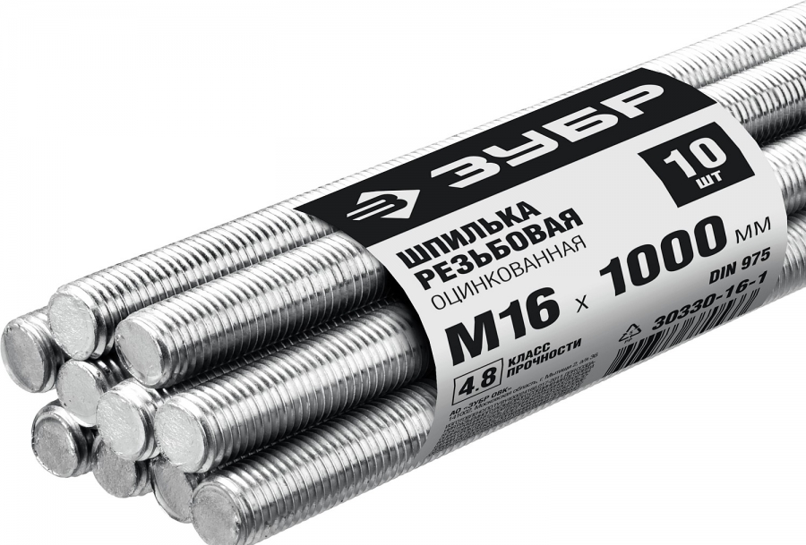 Шпилька резьбовая DIN 975, М16x1000мм, 10 шт, класс прочности 4.8, оцинкованная, ЗУБР 30330-16-1