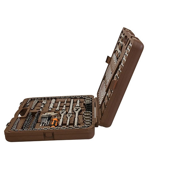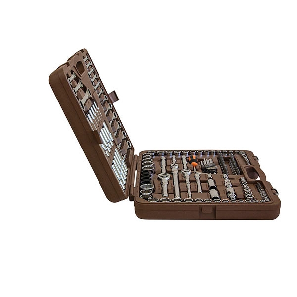 1/4"DR Головки торцевые 1/4"DR, 10 шт.: 4, 5, 6, 7, 8, 9, 10, 11, 12, 13 мм Головки торцевые SAE 1/4"DR 10 шт.: 5/32”, 3/16”, 7/32”, 1/4”, 9/32”, 5/16”, 11/32”, 3/8”, 7/16”, 1/2” Головки торцевые глубокие 1/4"DR 6 шт.: 4, 5, 6, 7, 8, 9 мм Удлинитель 1/4"DR 100 мм Отверточная рукоятка 1/4"DR Трещоточная рукоятка 1/4"DR Шарнир карданный 1/4"DR Адаптер для вставок-бит 1/4"DR Вставки-биты Т-TORX® 1/4"DR: T10, 15, 20, 25, 27, 30, 40 3/8"DR Головки торцевые 3/8"DR, 11 шт.: 9, 10, 11, 12, 13, 14, 15, 16, 17, 18, 19 мм Головки торцевые SAE 3/8"DR 9 шт.: 3/8”, 7/16”, 1/2”, 9/16”, 5/8”, 11/16”, 3/4”, 13/16”, 7/8” Головки торцевые глубокие 3/8"DR 6 шт.: 10, 11, 12, 13, 14, 15 мм Головки торцевые свечные 3/8"DR 16, 21 мм Трещоточная рукоятка 3/8"DR Удлинители 3/8"DR: 75, 150 мм Шарнир карданный 3/8"DR Торцевые насадки со вставками 3/8"DR, 22 шт.: (PH) 1, 2, 3 (PZ) 1, 2, 3 (T)20, 30, 40 (SL) 4, 5.5, 6.5 (T-TORX®) T45, 50, 55, 60 (H) 3, 4, 5, 6, 8, 10 1/2"DR Головки торцевые 12-гр. 1/2"DR, 7 шт.: 20, 21, 22, 24, 27, 30, 32 мм Головки торцевые 12-гр. SAE 1/2"DR, 4 шт.: 15/16”, 1”, 1-1/16”, 1-1/4” Головки торцевые глубокие 1/2"DR 6 шт.: 10, 12, 13, 14, 17, 19 мм Головки торцевые ударные 1/2"DR 4 шт.: 17, 19, 21, 23 мм Трещоточная рукоятка 1/2"DR Удлинители 1/2"DR: 125, 250 мм Шарнир карданный 1/2"DR Ключи угловые шестигранные, 10 шт.: 1.5, 2, 2.5, 3, 4, 5, 6, 7, 8, 10 мм Ключи комбинированные 12 шт.: 8, 9,10, 11, 12, 13, 14, 15, 16, 17, 18, 19 мм Ключи накидные трещоточные, 3 шт.: 8х10 мм, 12х13 мм, 17х19 мм Пластиковый кейс.